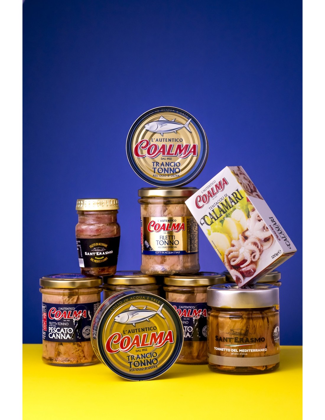 La nostra box bestseller unisce i prodotti più amati della linea Coalma e Sant'Erasmo. Solo tranci e filetti di tonno pinna gialla lavorati secondo antica ricetta dal 1922 cotti in acqua e sale come da nostra tradizione.