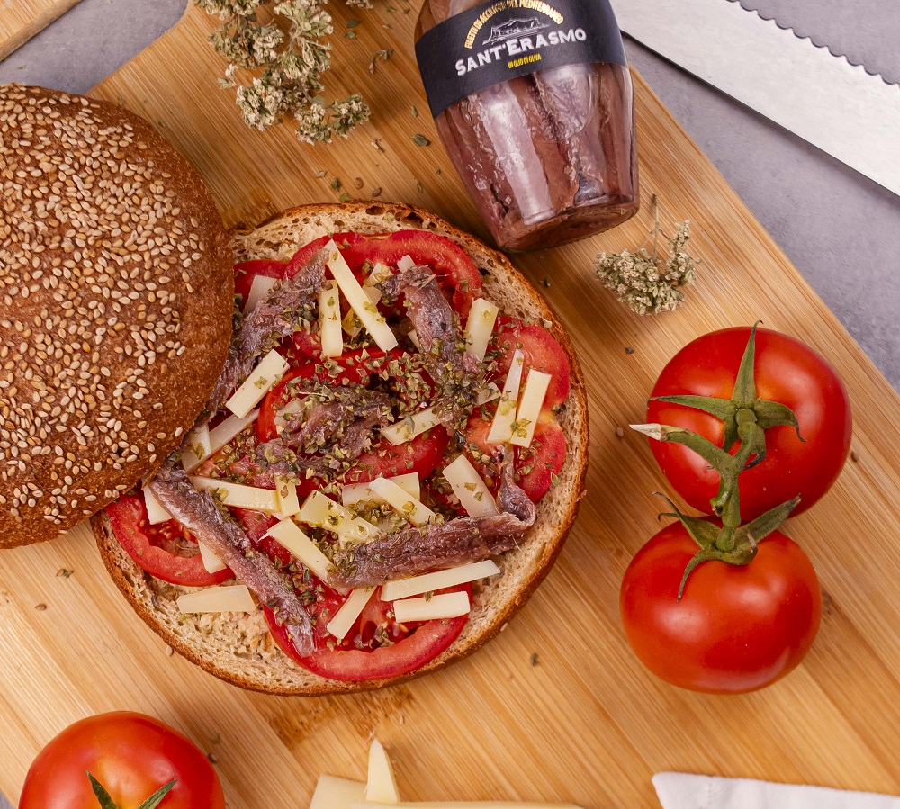 - Taglia a fette sottili il pomodoro e farcisci una calotta. Aggiungi i filetti di acciughe, dei pezzettini di formaggio caciocavallo.